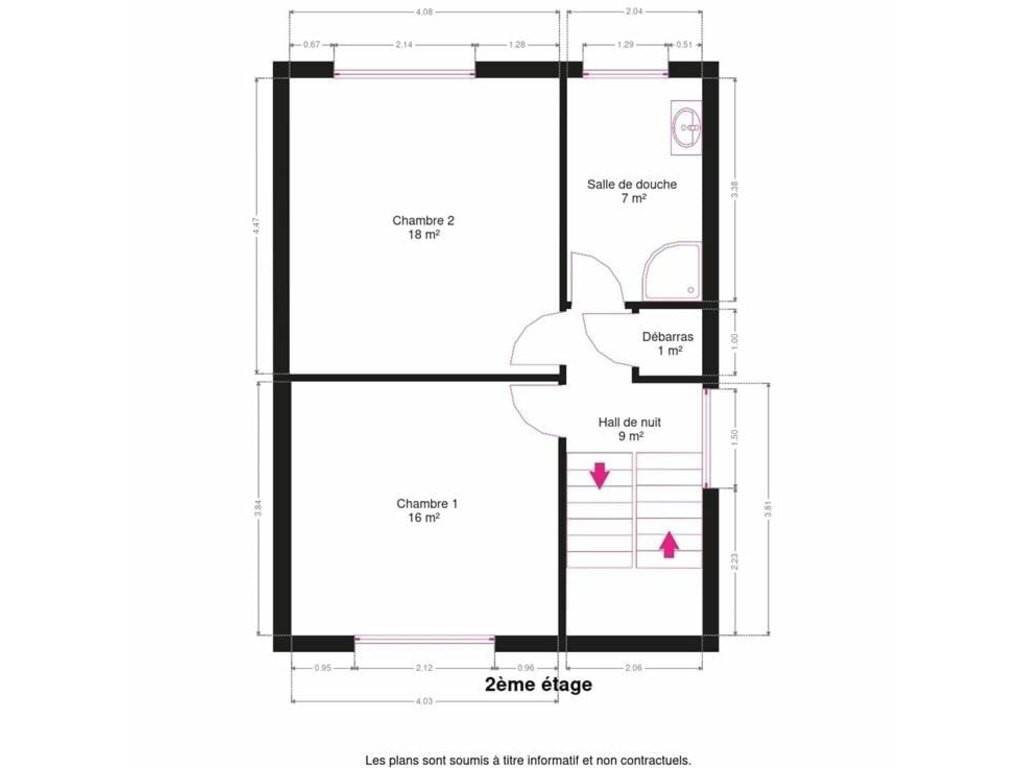 2ème étage : · 1 chambre · Grenier aménageable de 19 m² (chambre supplémentaire, bureau, espace loisirs)