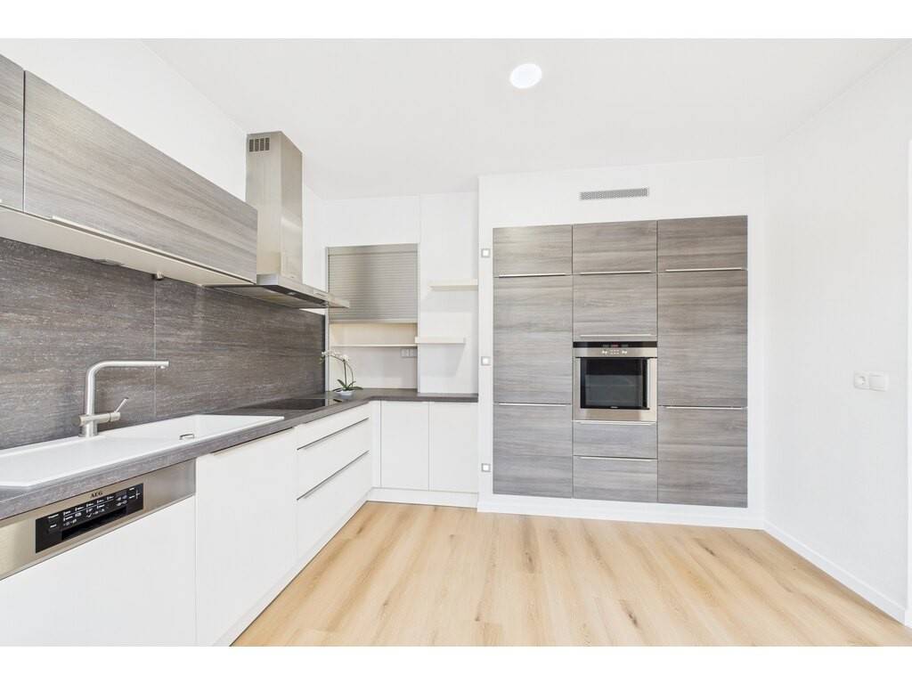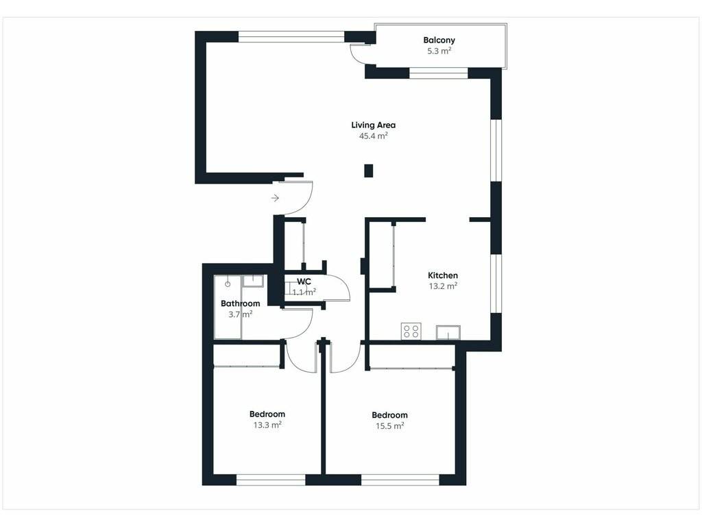 Layout: kitchen opening onto the living/dining room (43.3 sqm) - kitchen (11.4 sqm) - Separate toilet (0.9 sqm) - Bathroom (3.6 sqm) - Bedroom 1 (11.8 sqm) - Bedroom 2 (13.4 sqm)
