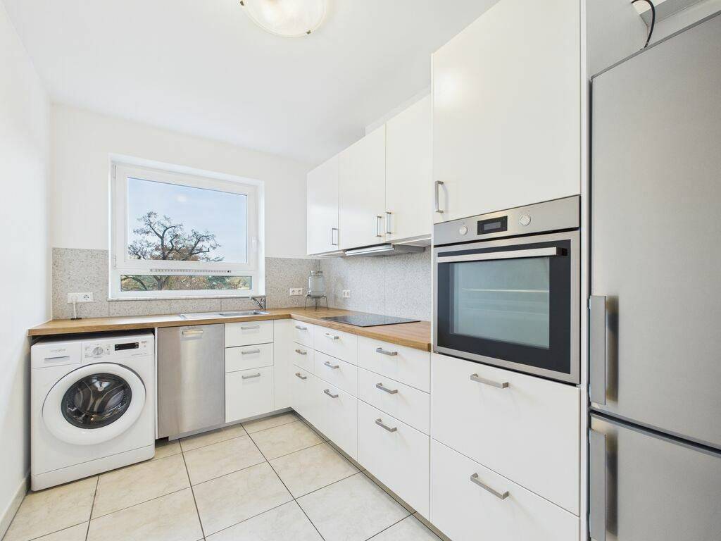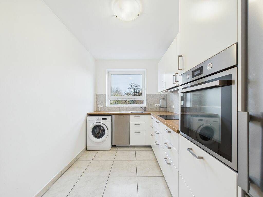 The property features two generously sized bedrooms of 17m² each, both opening onto a south facing 5m² balcony overlooking the quiet rear of the building. The separate kitchen and the living room enjoy lovely open views towards Luxembourg City, including the iconic arched aqueduct bridge. Thanks to its position and quality construction, the apartment benefits from complete tranquillity with no traffic noise.