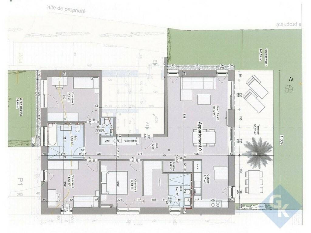 Composition du bien de 130.98 m²: hall d'entrée (12 m²) - cuisine ouverte (9.70 m²) - séjour (30.12 m²) - terrasse (30 m²) - jardin privatif - chambre (17.94 ) avec dressing et salle de douche privative (4.27 m²) - chambre 2 (13.60 m²) - chambre 3 (14.42 m²) - salle de bain (7.53 m²) - débarras (2.02 m²).