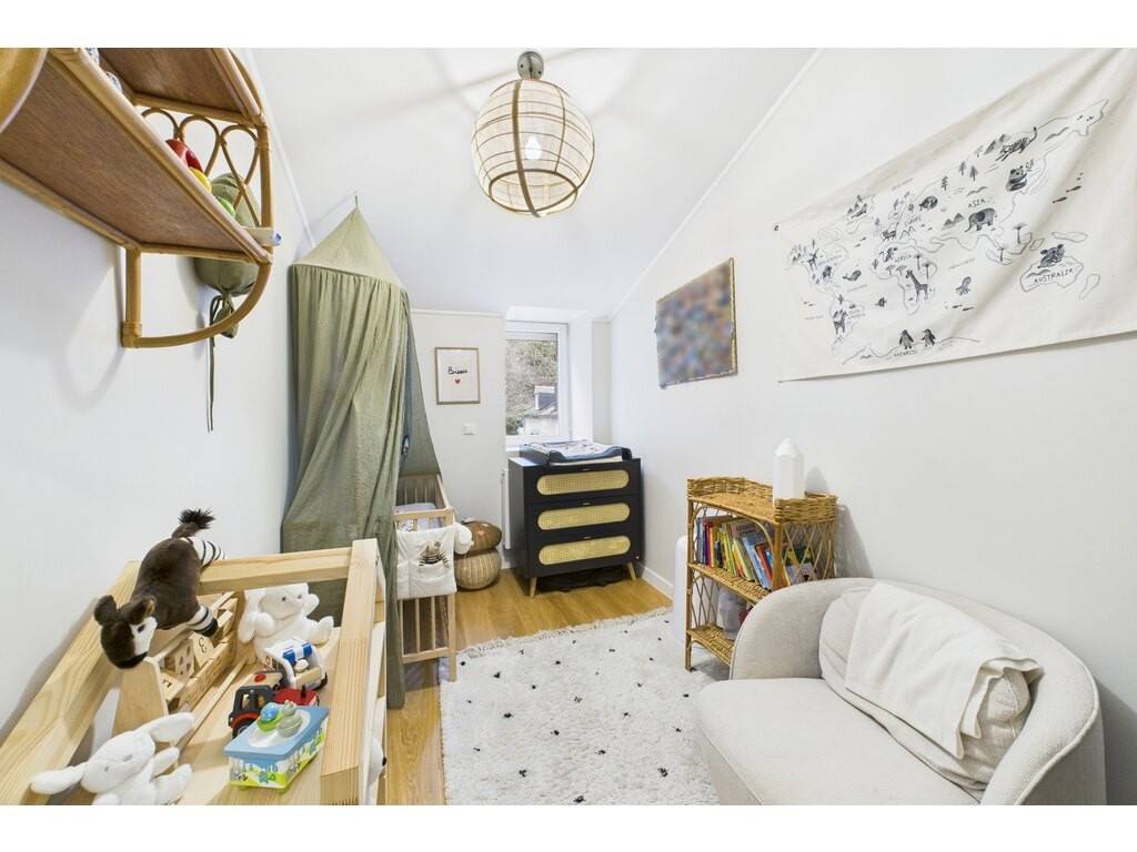 The first floor is reserved for the parents, with a large bedroom and a large bathroom with bathtub, shower and en-suite WC. On the second floor, there are two bedrooms and a living room.