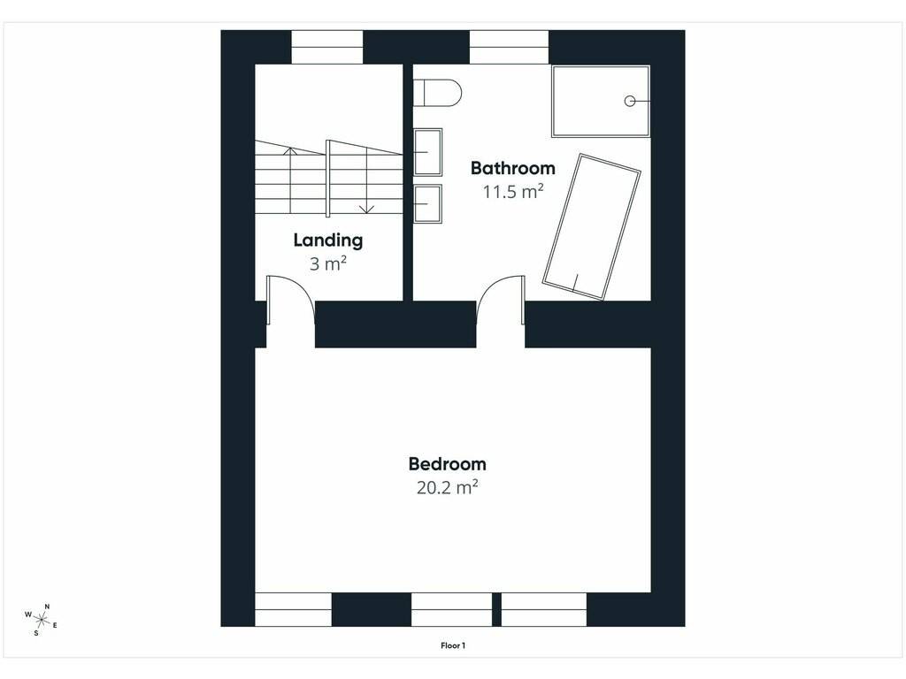 1st floor: landing (3 sqm) - master bedroom (20.2 sqm) - bathroom with bath and shower (11.5 sqm)