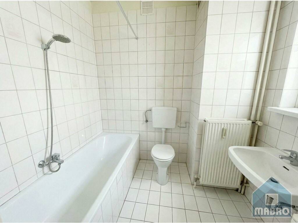In a house built in 1946, with 3 apartments (one per floor) the property is located on the 1st floor: +/-55m2: an entrance hall, a living room facing the street, a full bathroom, a sunny kitchen with a view of the garden (1/3 privatized) facing southwest, and a large bedroom, also at the rear, in the basement, a large private cellar and a shared laundry room with direct access to the garden. Gas heating (2013) Energy Class H, Thermal Insulation I