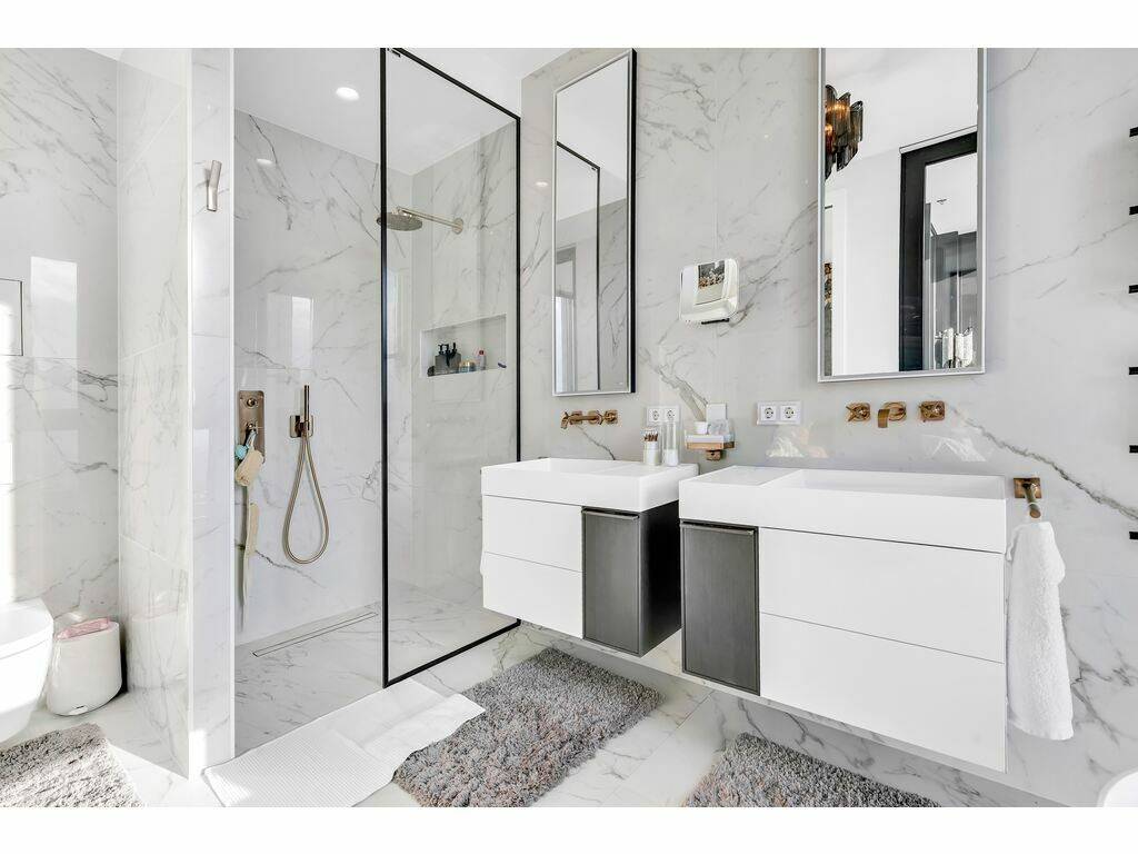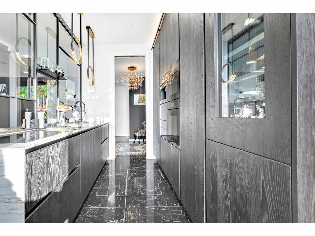 The high-end kitchen, crafted from single-block Italian natural stone, is fully equipped with Miele and Gaggenau appliances (under warranty until 2031) and is complemented by a separate laundry room.