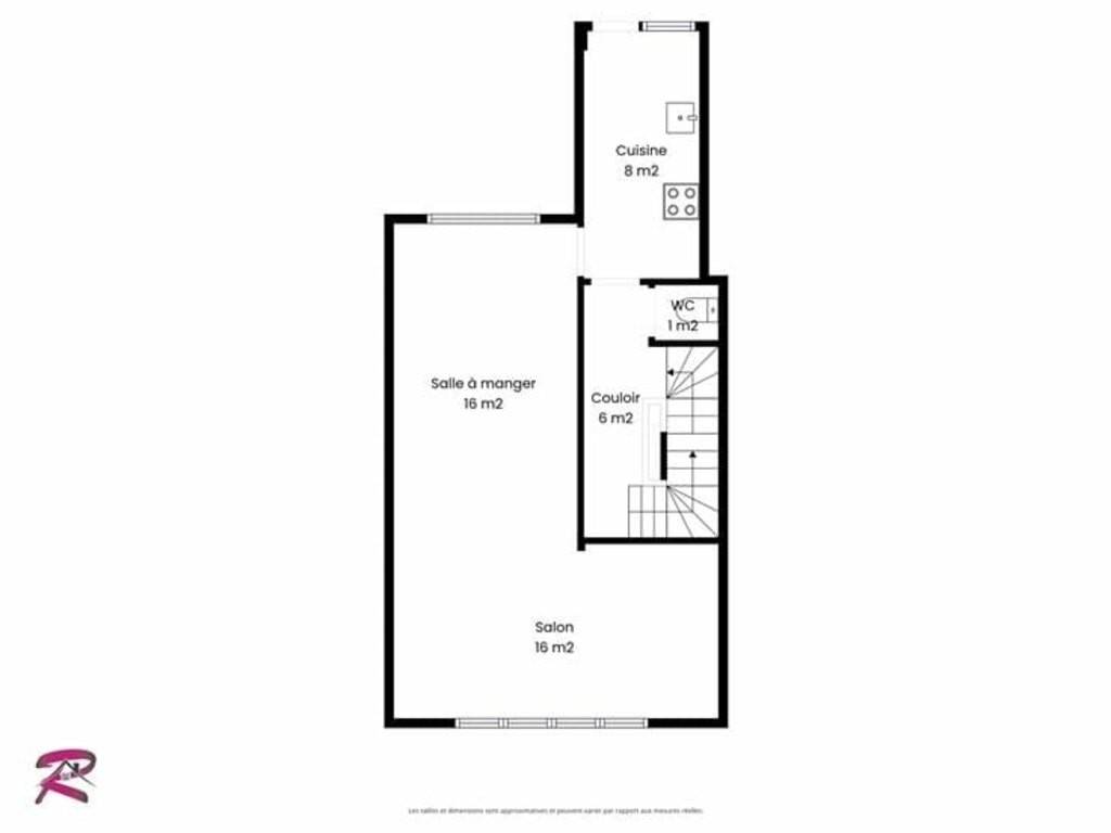 Au premier étage : Un hall d'entrée, un séjour de 31m², une cuisine équipée donnant accès aux extérieurs ;