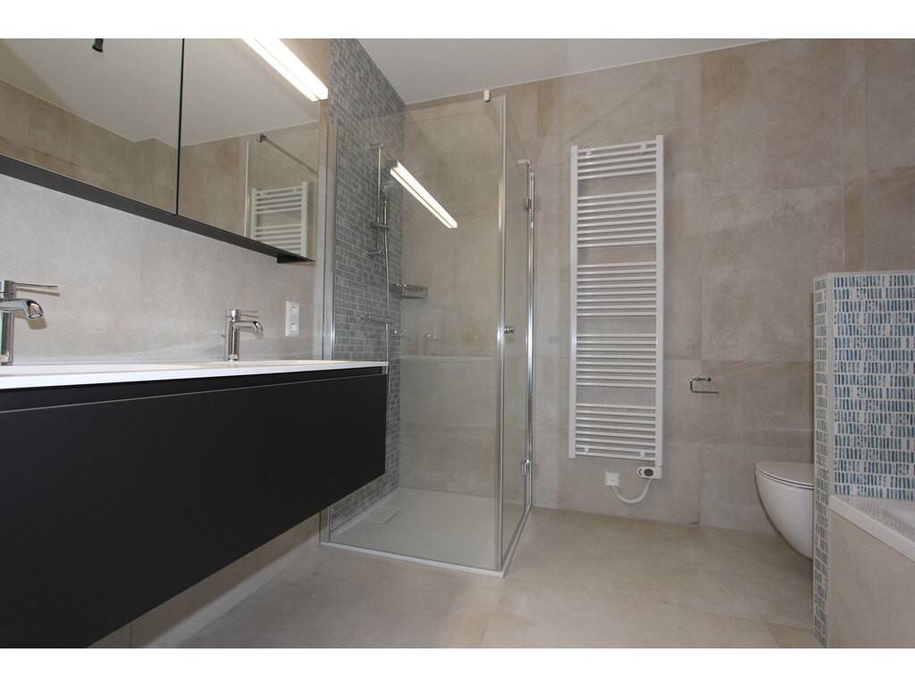A partir du hall d'entrée vous trouverez la cuisine équipée ouverte et le grand living/salle à manger avec accès au balcon, ensuite deux chambres à coucher, une salle de bains (double-lavabo, WC, douche et baignoire), et près du hall d'entrée un WC séparé.