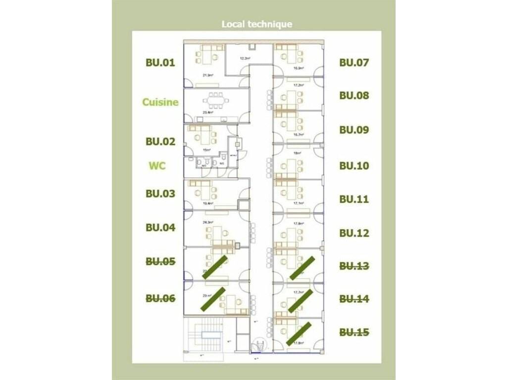 15 cabinets indépendants sont disponibles à la vente, avec possibilité de location flexible à l’heure, à la demi-journée, à la journée ou au mois. Loyer dégressif selon la durée.