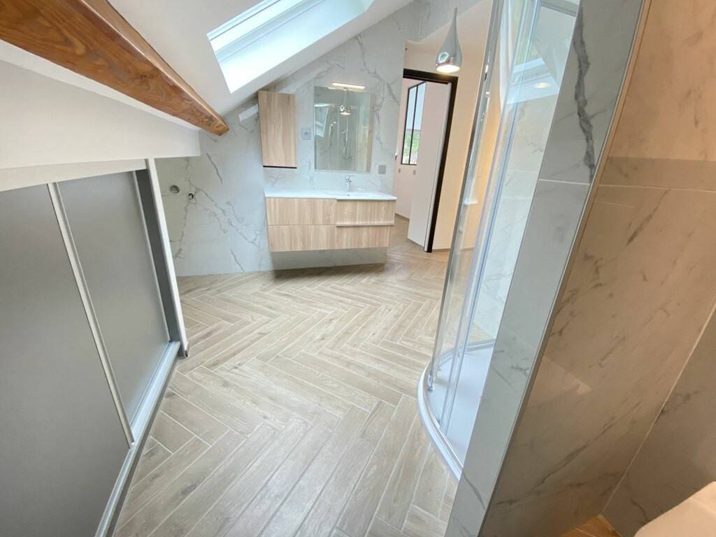 - grande chambre avec verrière - cuisine totalement équipée et ouverte sur l'espace de vie - salle de douche spacieuse - escaliers avec accès à un étage supérieur pouvant servir de bureau ou chambre d'appoint