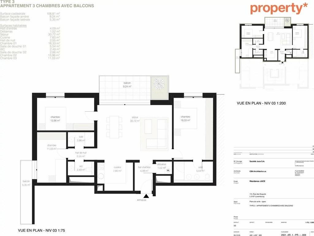 Address : Kirchberg - Rue des Muguets Cadastral surface area: 106.81 sq.m. Exterior : 2 balconies (9.24 m² + 5.35 m²) 3 bedrooms | 2 shower rooms | separate WC