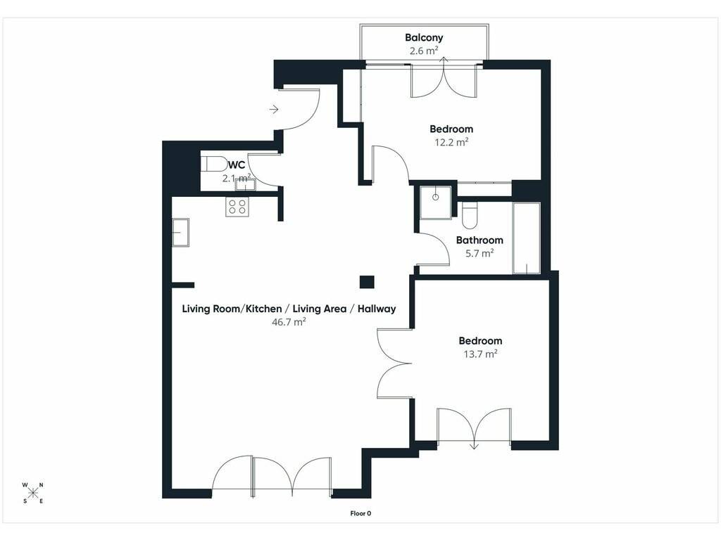 Layout: living/dining room (46.7 sqm) - bathroom with toilet (5.7 sqm) - 2 bedrooms (13.7 sqm - 12.2 sqm) - separate toilet (2.1 m²)