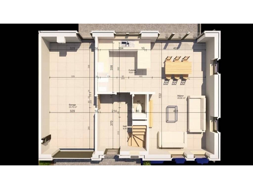 Au rez-de-chaussée : • Hall d’entrée avec WC indépendant • Séjour lumineux ouvert sur la cuisine • Cuisine • Garage / Buanderie • Terrasse • Jardin