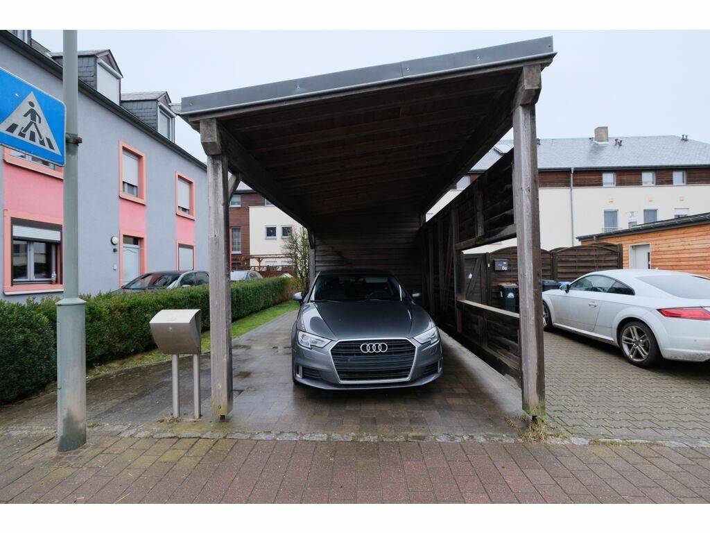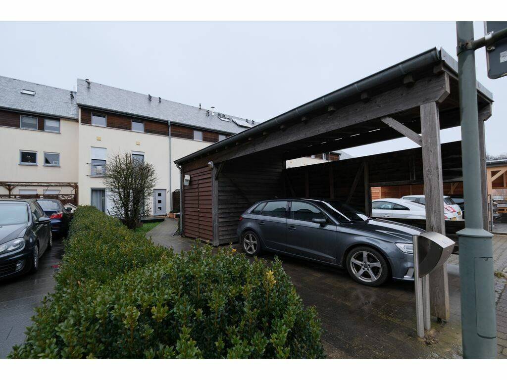 A l'avant de la maison une belle terrasse de +/- 20 m2, coin barbeque, abri de jardin et un carport pour 1 voiture.