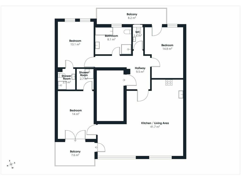 Layout: entrance hall/corridor (9.5 sqm) - living room/kitchen/dining room (41.7 sqm) - bedroom (14.8 sqm) with en-suite shower room (2.7 sqm) - bedroom (14.8 sqm) - bathroom with shower and toilet (8.1 sqm) - WC (1.6 sqm) - master bedroom (13.1 sqm) with en-suite shower room and WC (2.7 sqm).