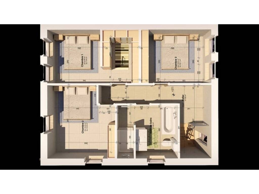 ️ À l’étage : • Hall de nuit • 1 chambre principale avec dressing • 2 chambres • 1 salle de bain complète avec douche, baignoire, WC et lavabo