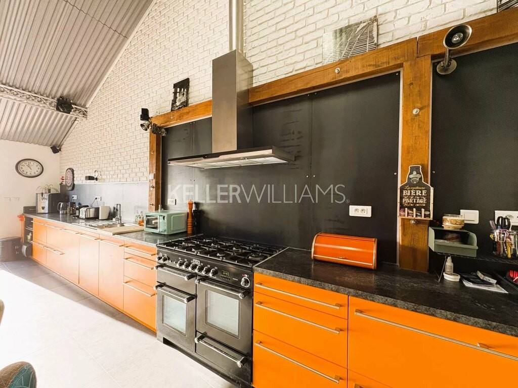 Une cuisine entièrement équipée, feux gaz, 3 fours, meubles bas. La pièce à vivre donne directement sur une terrasse orientée plein sud de 31m².