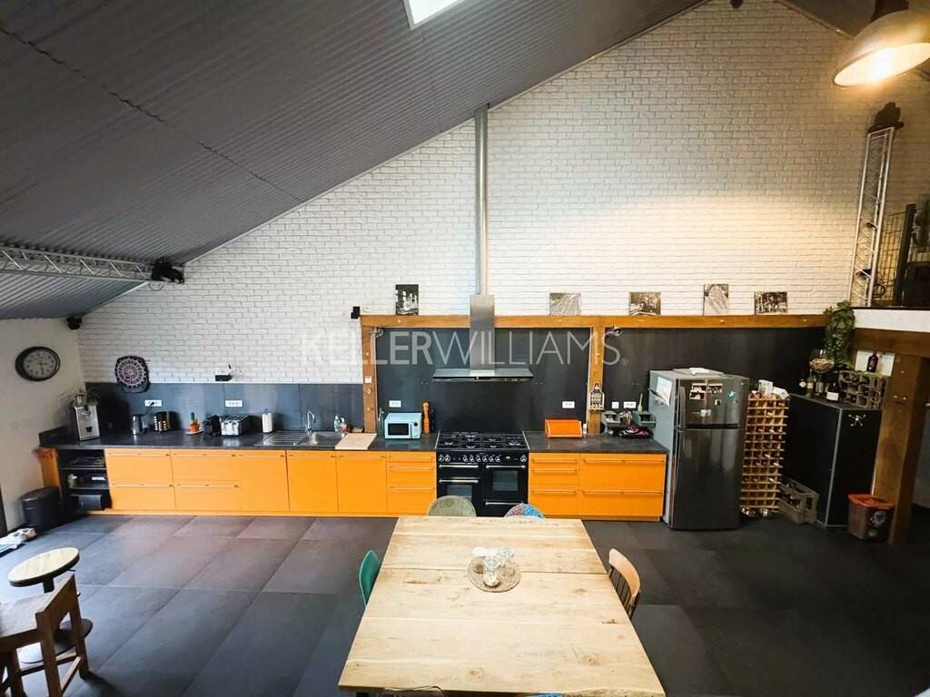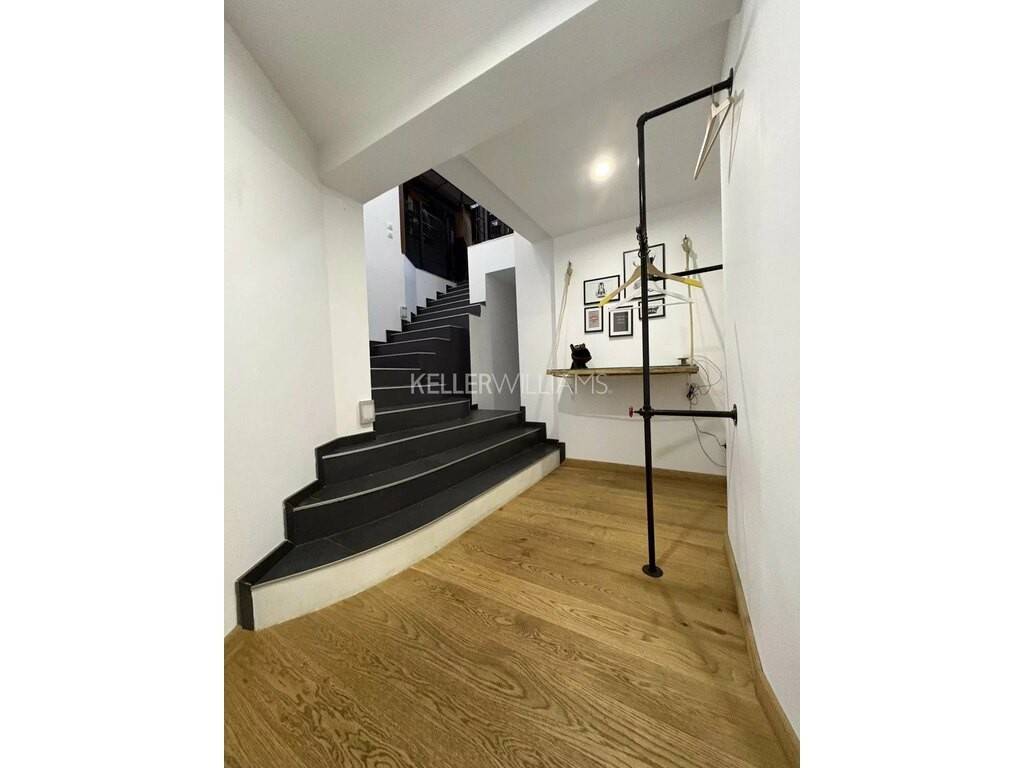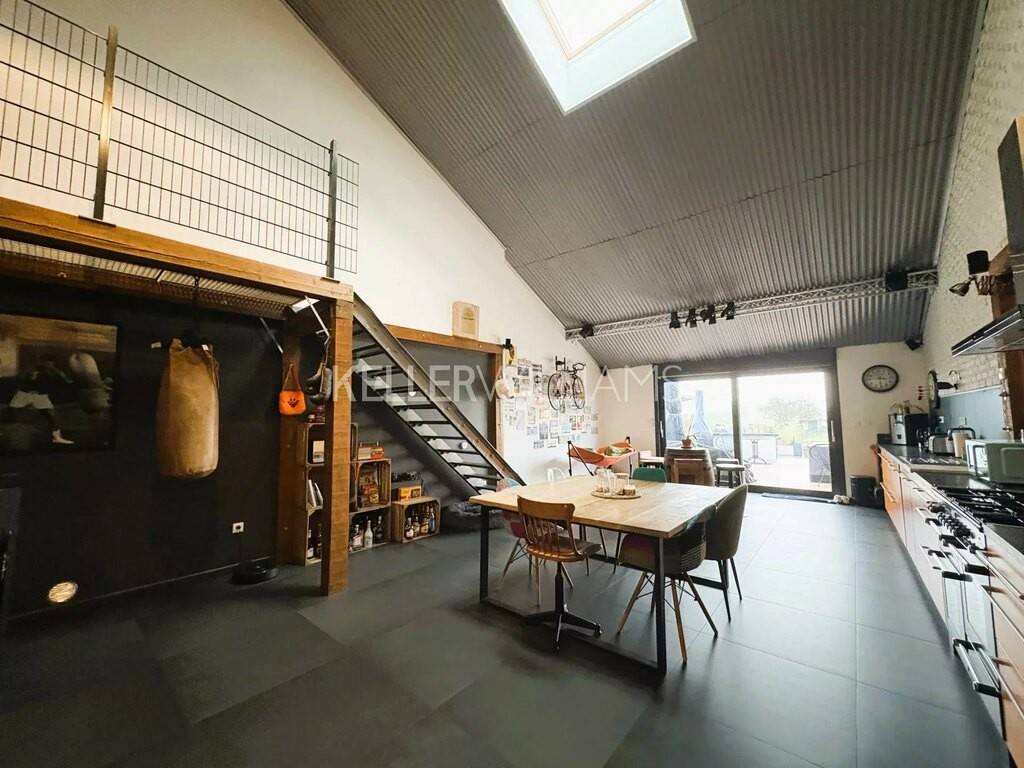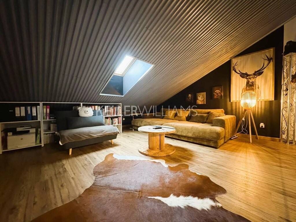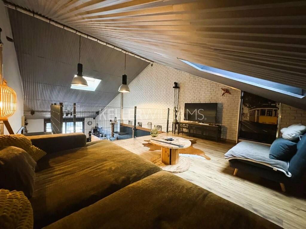 Un escalier industriel mène à un salon cozy et à une 4ème chambre de 21.50m².
