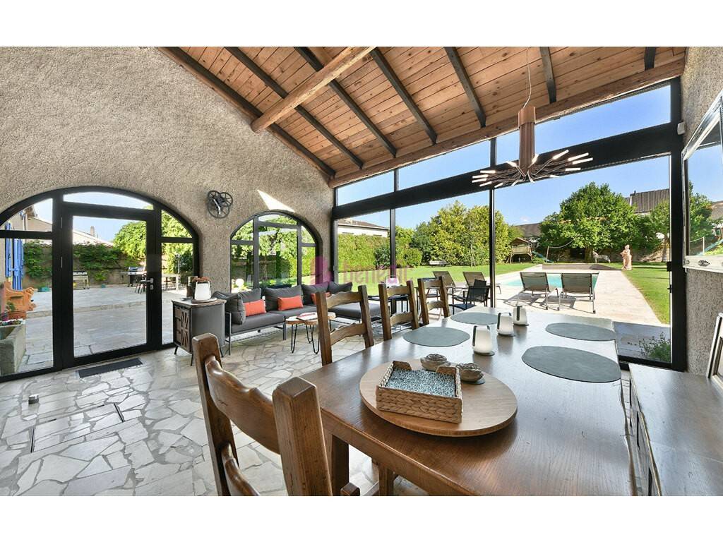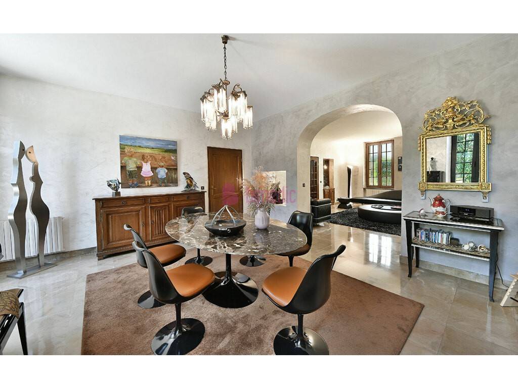 À l'extérieur, le jardin arboré et paysagé offre un cadre verdoyant et intimiste, rythmé par de nombreux espaces de détente. La piscine s'intègre parfaitement dans ce décor naturel, tandis qu'un terrain de pétanque vient compléter ces lieux propices à la convivialité. Une véranda climatisée permet de profiter pleinement de la vue sur le jardin en toute saison, prolongeant ainsi agréablement les espaces de vie.