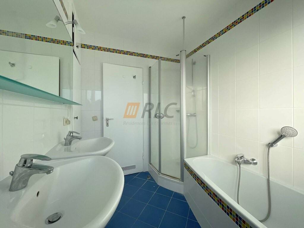 The apartment is composed as follows: - Entrance hall with cupboard - Living room 32.72 m2 - 1 bedroom of 17 m2 - 2 bedrooms with closets - Bathroom with bath, shower and 2 basins and window - 1 separate fitted kitchen with balcony - 1 separate WC