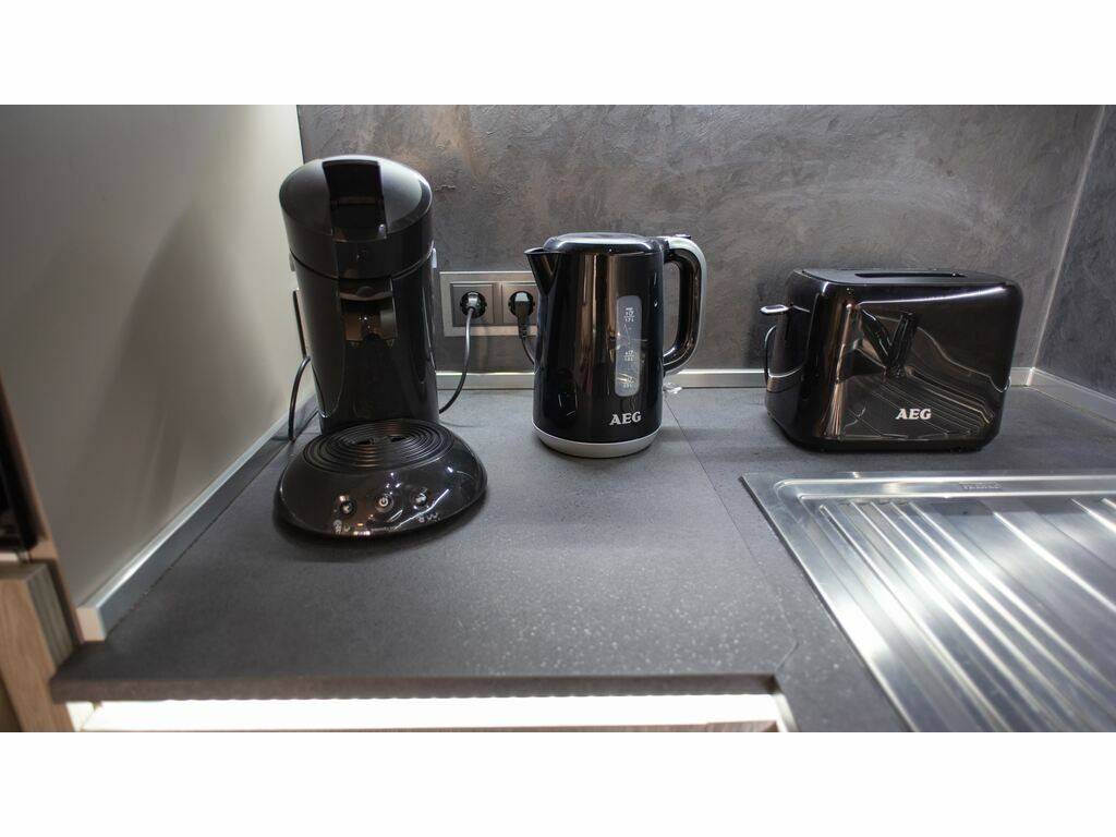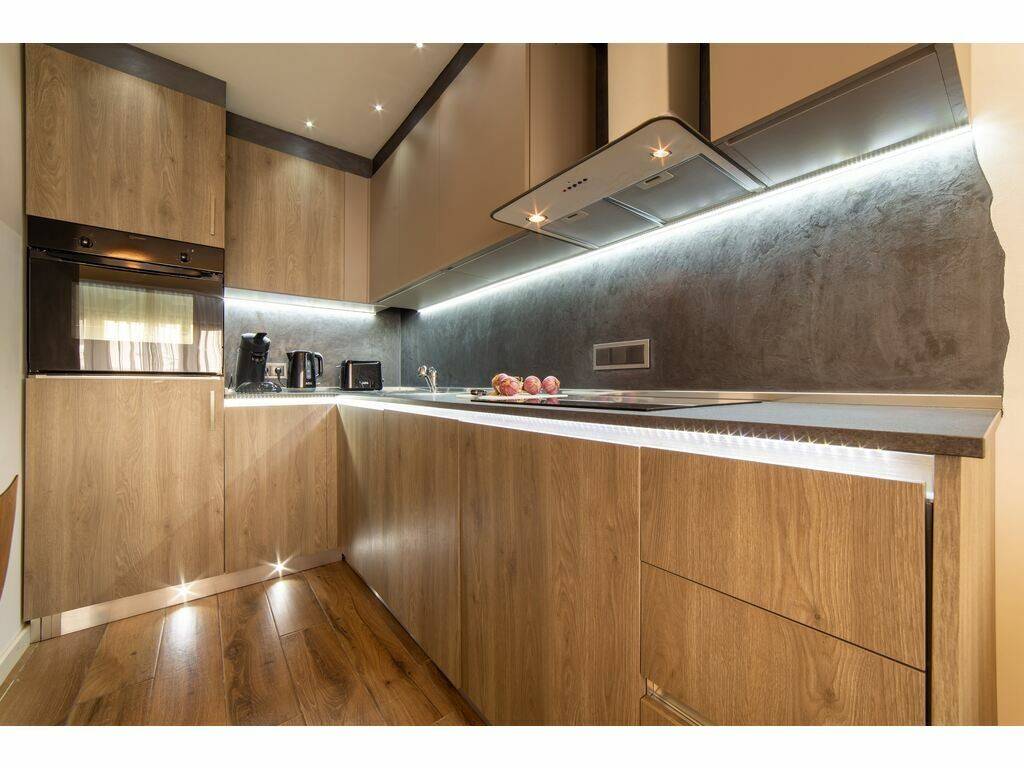 A fully equipped open kitchen (refrigerator, oven, coffee machine, kitchen utensils, etc.)