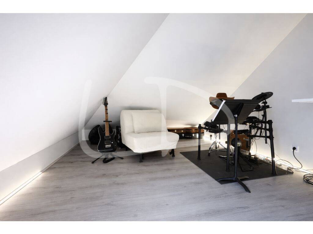 Le dernier étage révèle un grenier entièrement aménagé, laissant libre cours à l’imagination : ici, les propriétaires ont créée un espace de musique et de rangement. Une cave en sous-sol vient compléter l’ensemble et apporte un espace de rangement pratique et discret.