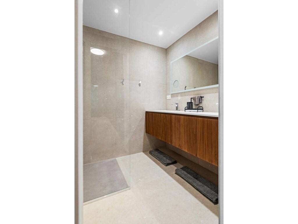 Au rez-de-chaussée : un appartement de ± 80m² comprenant une partie cuisine, un débarras, un séjour, un wc séparé, une salle de bain (baignoire, double vasque, wc) ainsi que deux chambres. L'appartement donne accès à une terrasse.