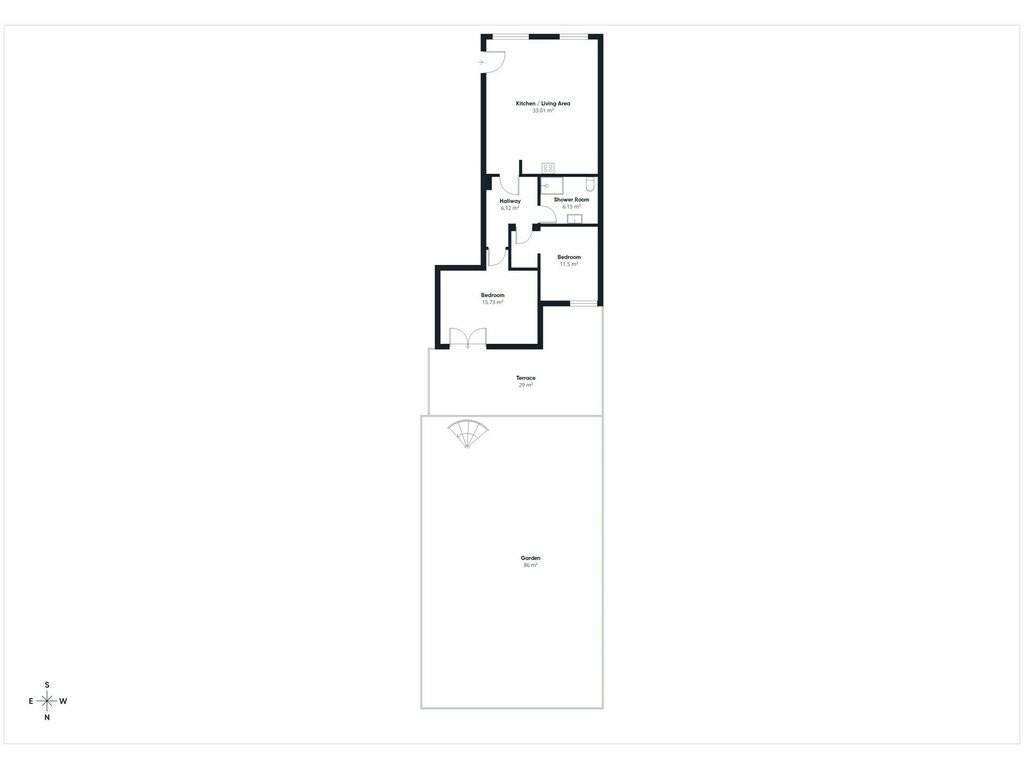 Distribution: Fully open-plan equipped kitchen and living room (33 sqm) - shower room (6.2 sqm ) - night hall (6.1 sqm ) - 2 bedrooms (11.5 sqm and 15.7 sqm), both with direct access to the terrace and private green space.