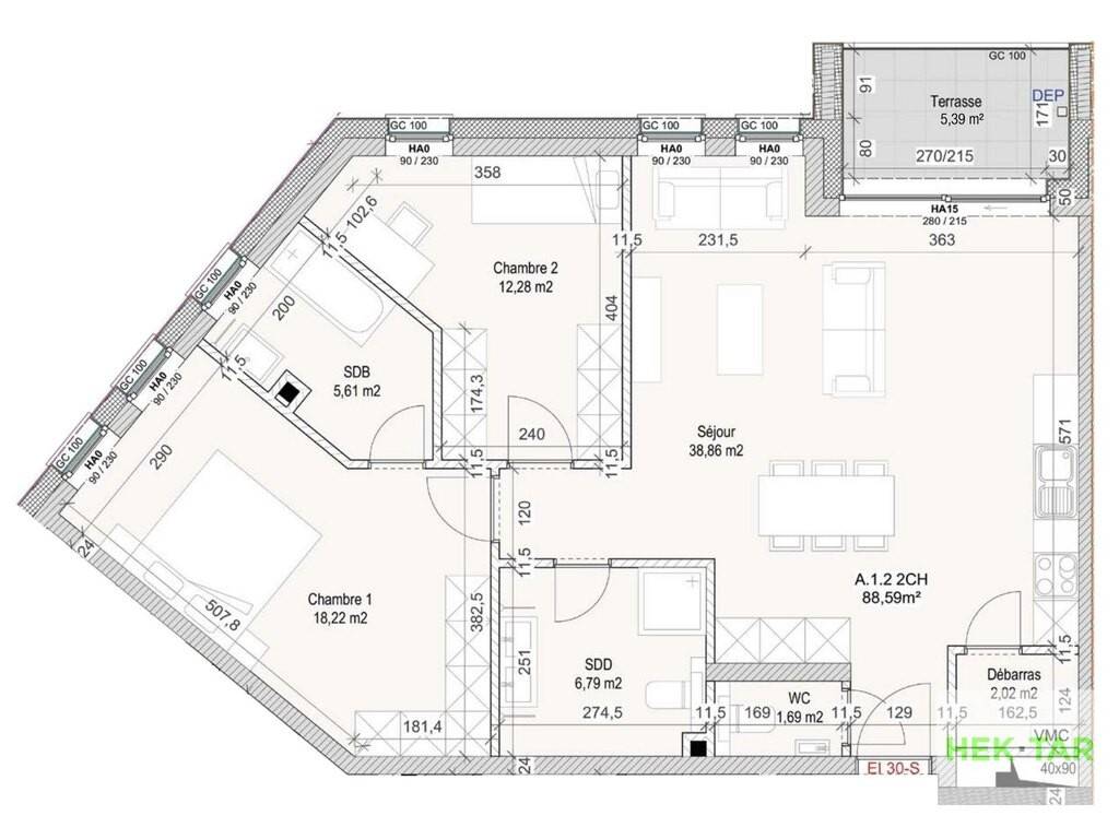 HEKTAR vous propose ce magnifique appartement (lot A 1.2) d'une surface habitable de 88,59 m², idéalement situé au coeur du village d'Oetrange, à seulement 300m à pied de la gare d'Oetrange.