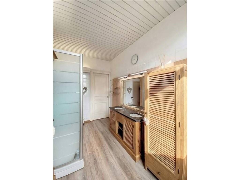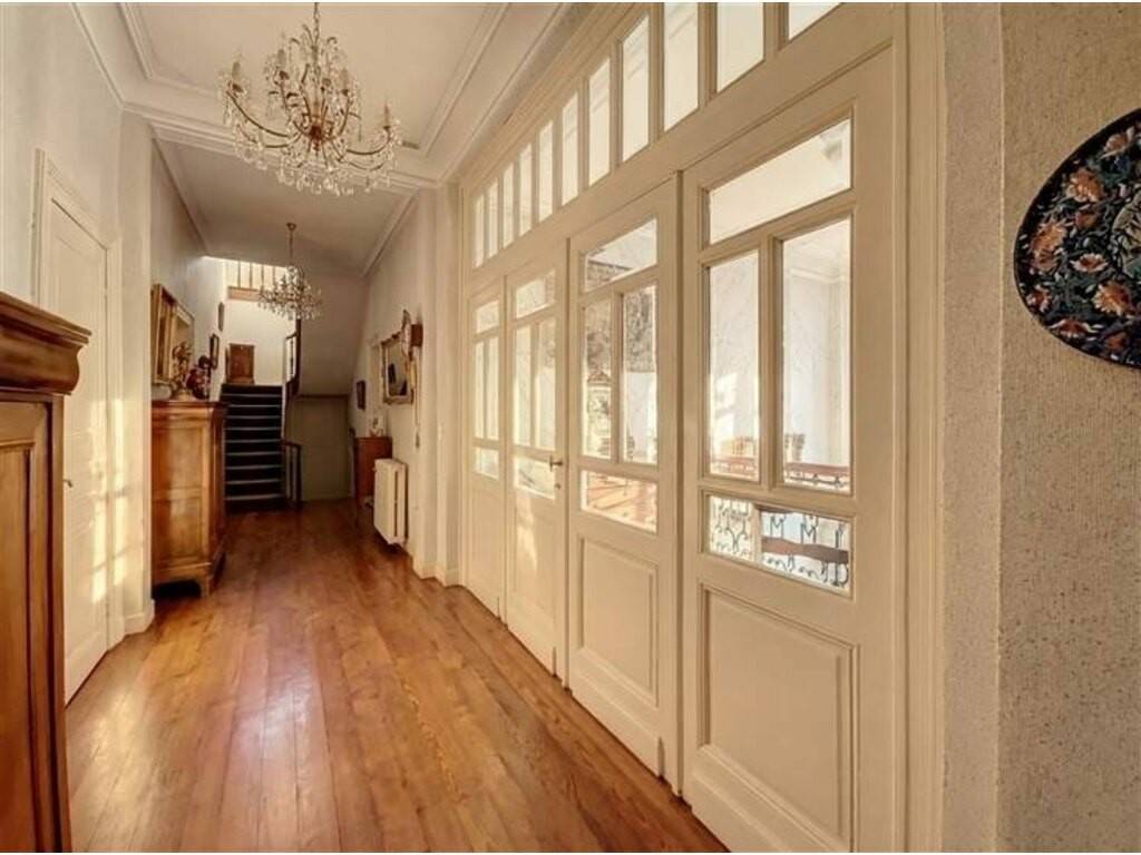 La demeure propose trois salles de bains bien aménagées pour servir le confort de ses occupants. L'intérieur déploie des espaces nobles avec des éléments de décoration d'époque incluant parquets d'origine, chandeliers raffinés et escalier majestueux avec tapis rouge caractéristique. Les pièces de réception affichent des volumes impressionnants et des finitions soignées, avec cheminées décoratives et boiseries de qualité.