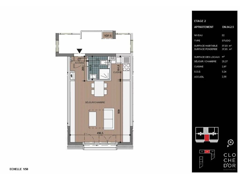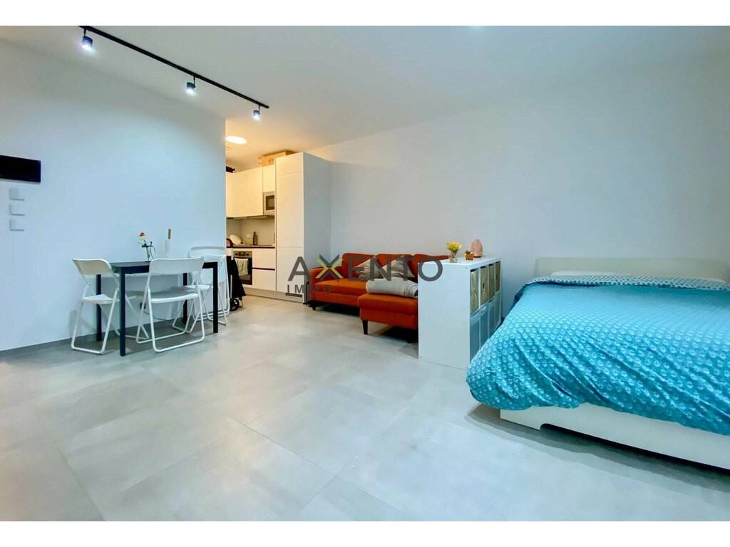 The 37m2 studio is located on the 2nd floor and is equipped with high quality finishes, a ventilation system, triple glazing, a smart home system and electric shutters.