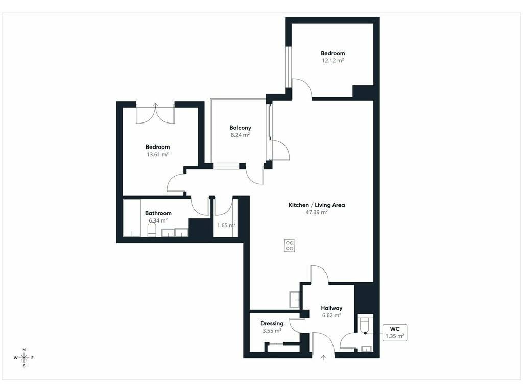 Distribution: entrance hallway (6.6 sqm) - dressing (3.6 sqm) - guest toilet ( 1.4 sqm) - kitchen/ living area (47.4 sqm) with direct access to the loggia - storage space (1.7 sqm) - 2 bedrooms (13.6 sqm + 12.1 sqm) - bathroom with bathtub , toilet and double sink (6.3 sqm)