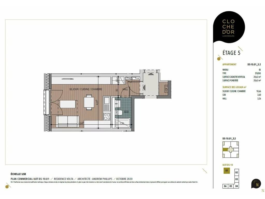 The studio of 29sqm is located on the 5th floor and consists of a living room with kitchen area, an entrance hall and a bathroom.