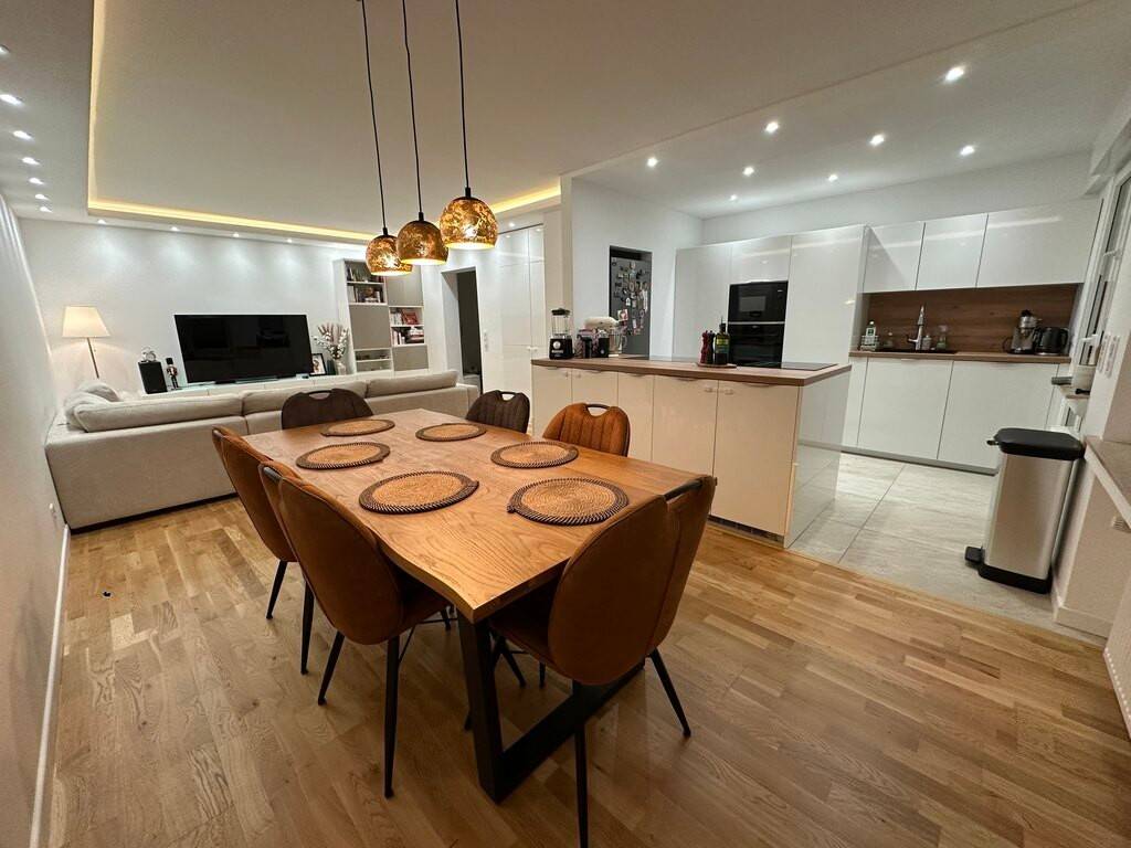 Une grande salle de vie spacieuse et lumineuse donnant sur la salle à manger composée d'une cuisine entièrement équipée desservie sur un balcon,