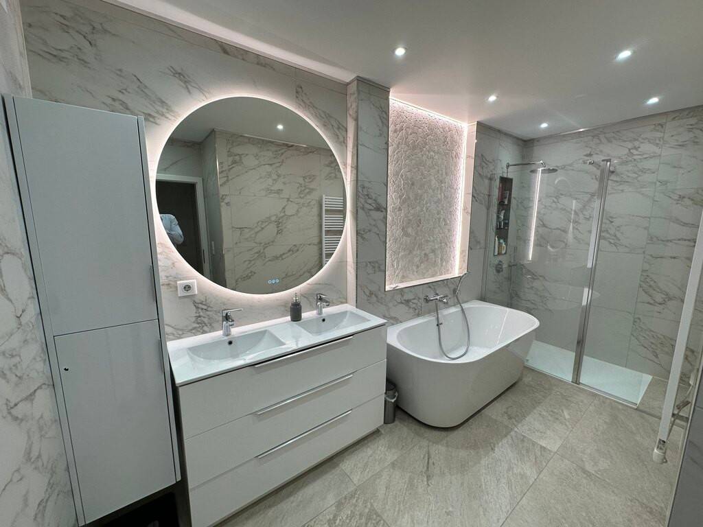 Une salle d'eau composée d'une douche à l'italienne et une baignoire intégrant une double vasque,