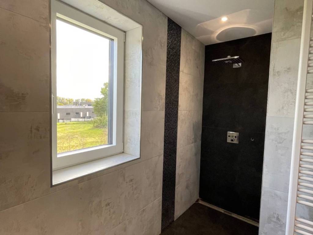 - Cuisine avec salle à manger et living avec de grandes baies vitrées donnant sur une terrasse de 8,15 m2 qui mène sur un jardin entièrement privatif de +- 240 m2, accessible directement par la terrasse