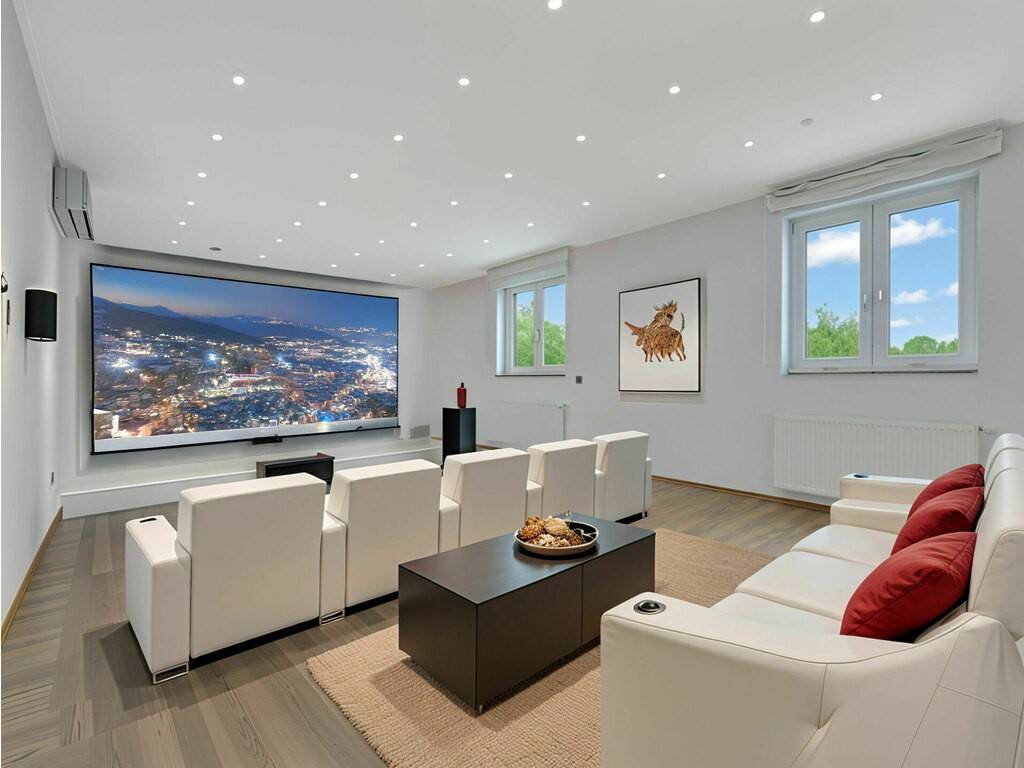 - a recreation room of approx. 43m², currently empty, with a cinema-style layout as shown in the photo (you could also make 2 more bedrooms or any other space you can imagine);