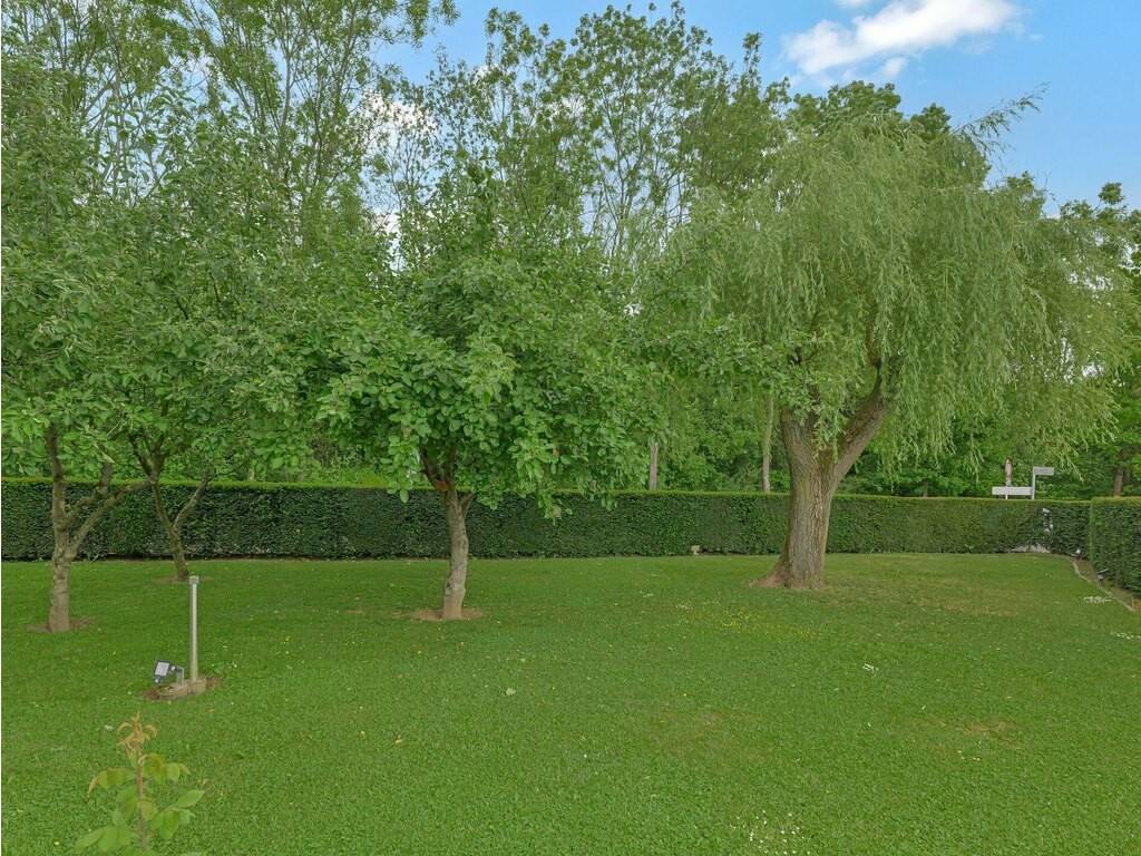Jardin soigné avec arbres fruitiers, terrasse et bassin à poissons.