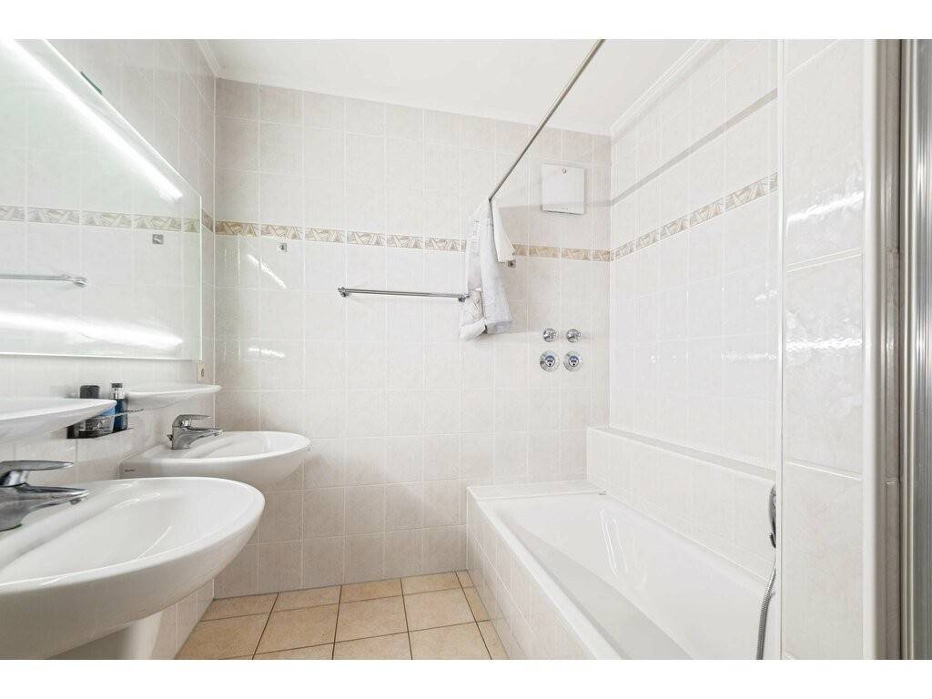 The bathroom of approximately 7 sqm features a bathtub, a separate shower, and double washbasins, offering optimal everyday comfort. A separate WC and a practical storage room of approximately 2 sqm complete the functional layout.