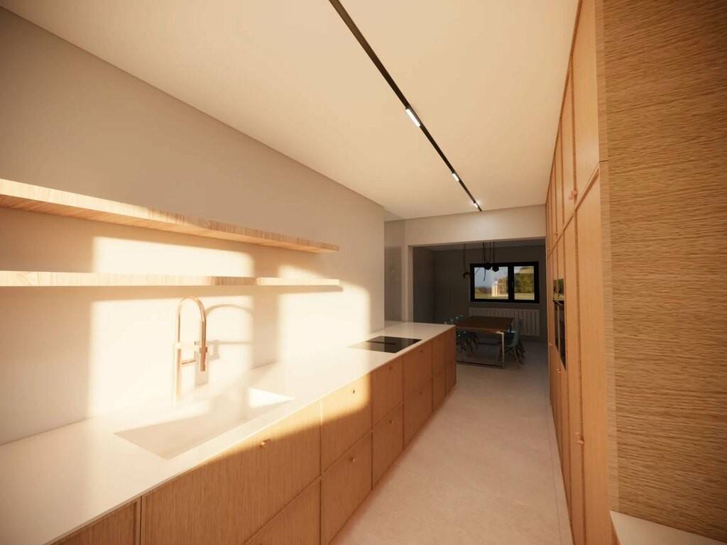 Hall d'entrée spacieux Espace cuisine et salle à manger de +/- 30 m2 Salon avec espace bibliothèque de +/- 35m2 WC séparé Terrasse couverte de 25m2 Au 2ème étage: