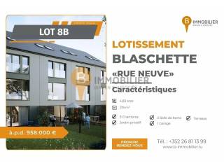 € 958 000Maison individuelle 219 m², neuve, Lorentzweiler Localité, LorentzweilerMaison bi-familiale située rue Neuve à Blaschette et d'une surface totale de 219 m2 et habitable de 176 m2. La maison est répartie sur 4 niveaux et se compose comme suit: - au rez-de-jardin : hall, cuisine ouverte sur la salle à manger avec accès à la terrasse et au jardin, réserve, WC séparés, local technique/buanderie - au rez-de-chaussée : hall d'entrée, séjour, garage pour une voiture - au 1er étage : hall de nuit, 2 chambres à coucher, salle de bains, salle de rangement - combles : suite parentale avec grand espace dressing et salle de bain privative, débarras Le sas d'entrée et le lo